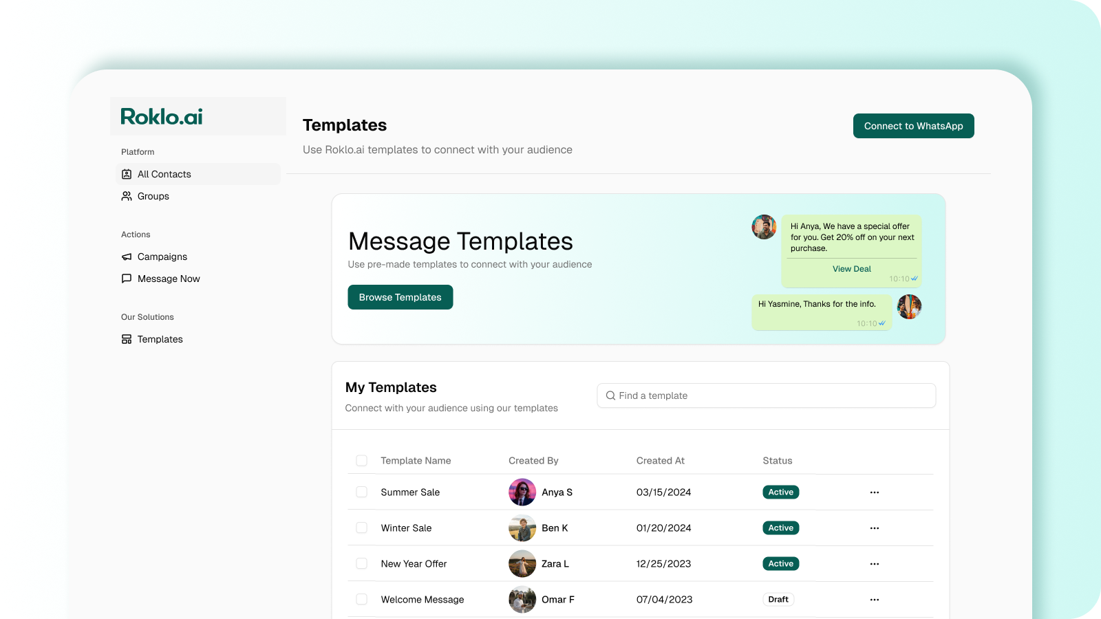 Roklo.ai sends messages sequentially in natural patterns rather than blasting them all at once. This mimics how real conversations happen and keeps WhatsApp's systems happy, which means your messages actually land in your contact's device instead of getting flagged.